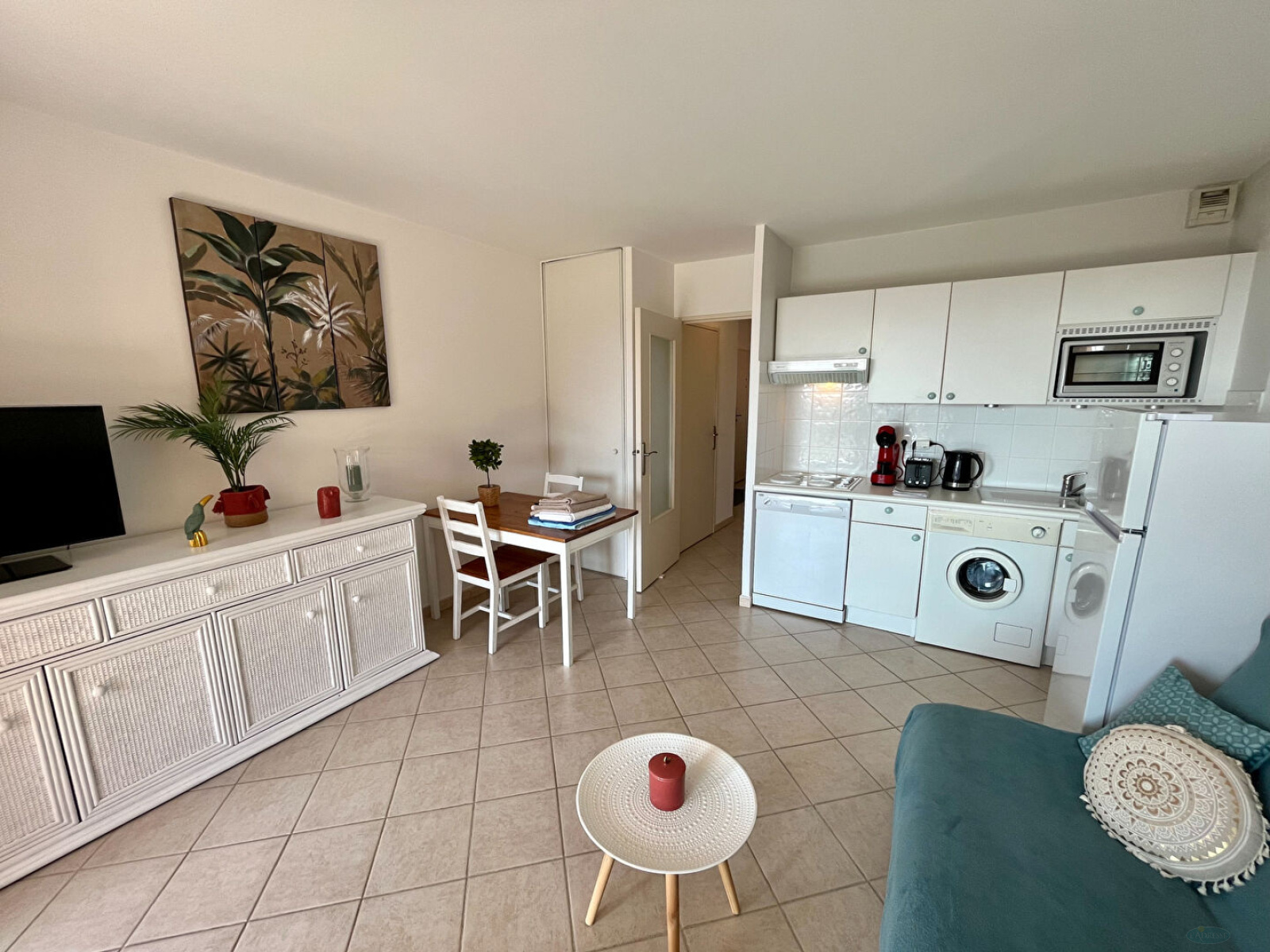 Ressourcement garanti entre Estérel et Méditerranée. Dans une résidence sécurisée avec piscine et gardien, agréable appartement 2 pièces meublé avec terrasse de 10m² comprenant : une entrée, une chambre avec un grand lit et rangement, une salle de bain, une cuisine américaine aménagée et équipée et un séjour ouvrant sur terrasse. Toilettes séparés. Un parking privatif. Proche du port, des plages et des chemins de randonnées. Disponible le 31 janvier 2026.