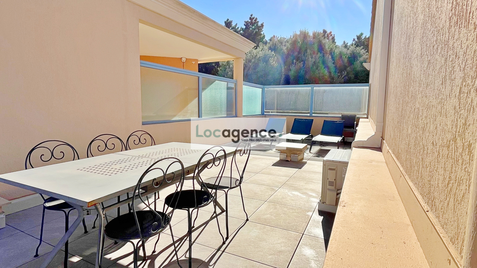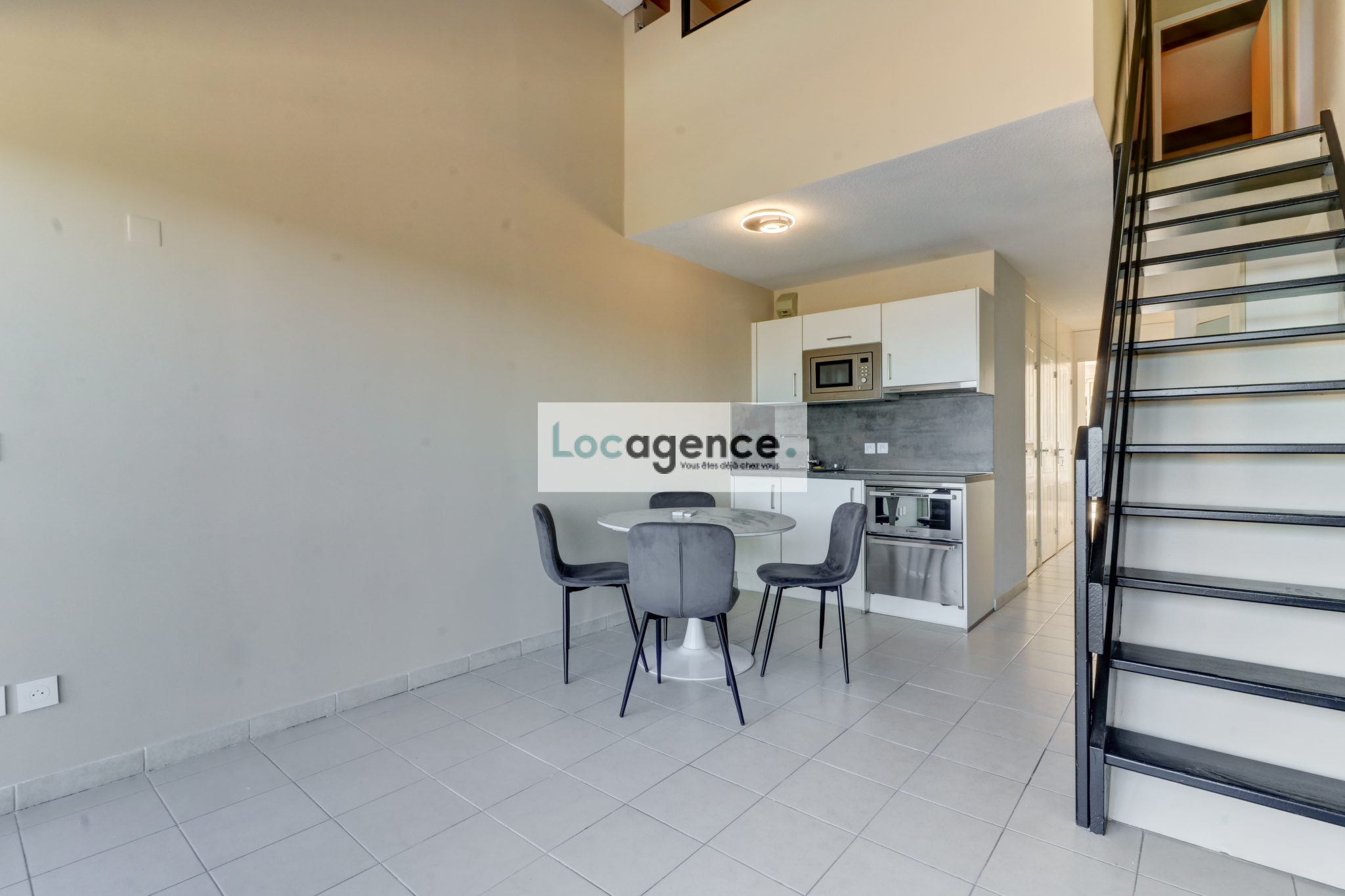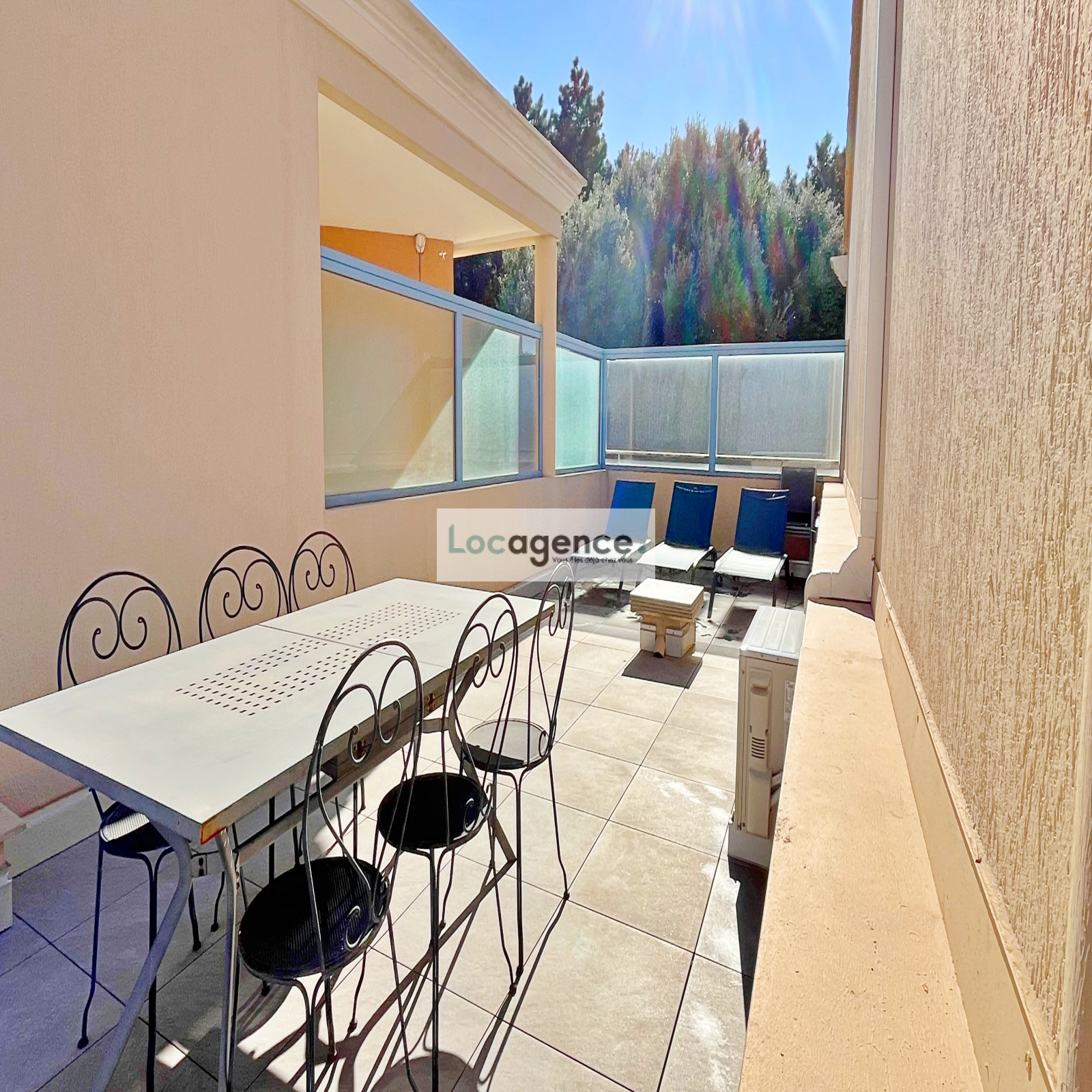 Dans résidence sécurisée avec gardien et piscine, Magnifique 3 pièces meublé en duplex entièrement climatisé comprenant : une entrée, un séjour/cuisine ouvrant sur balcon de 6m² puis sur une terrasse de 44m², une cuisine américaine équipée ( hotte, plaques, four, lave-vaisselle, réfrigératuer, congélateur, micro-ondes), une chambre avec placards, une salle de douche, un wc indépendant et une buanderie.